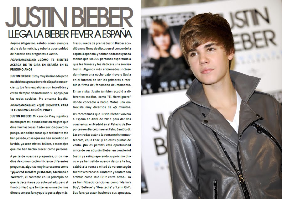 Különböző kérdéseket tettünk fel neki, köztük azt is, hogy 'Mit szeretsz jobban a közösségi hálózatok közül, a Facebook-ot vagy a Twittert?' Az énekes először nem akart választani, de végül bevallotta, hogy a Twittert, mivel közvetlenebb itt a rajongókkal. A sajtótájékoztató után, Justin Bieber a spanyol fővárosban autogrammot osztogatott, és sem több, sem kevesebb, mint 10.000 ember várta őt. Néhány rajongó az egész éjszakát ott töltötte hóban és esőben, hogy elsőként megkapja aláírását. Látogatása során, Justin részt vett különböző programokban, mint az El Hormiguero, ahol adott egy interjút. Ezuton is szeretnénk elmondani, hogy Justin Bieber visszatér Spanyolországba, 2011. áprilisában, hogy két koncertet adjon, méghozzá Madridban és Barcelonában.